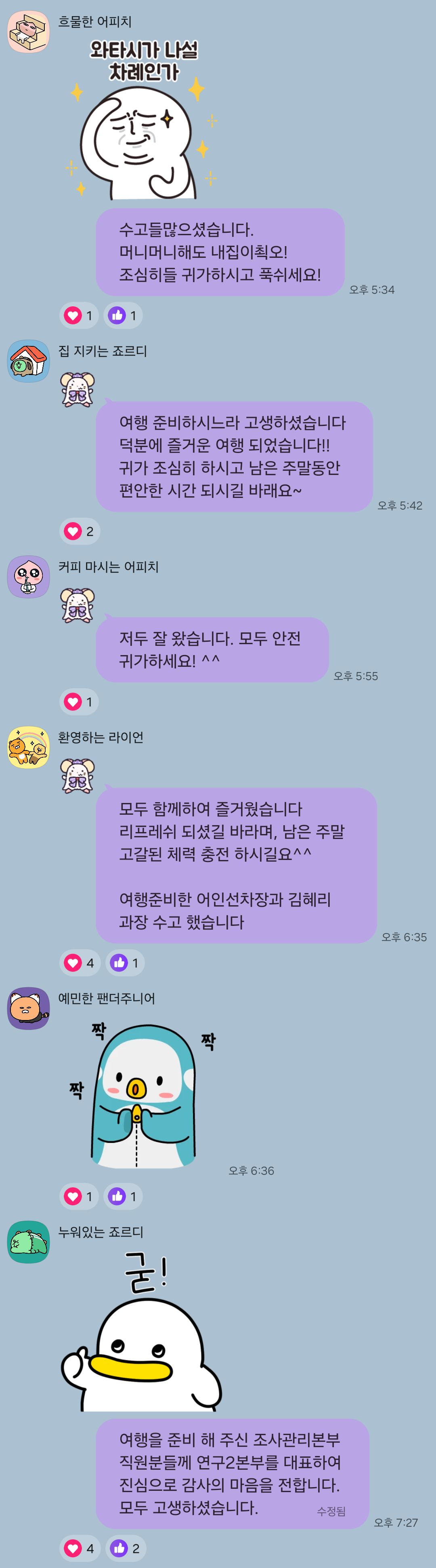 모두가 잠시 재충전의 시간을 보낸 만큼, 돌아온 후 더 건강한 분위기 속에서 함께 업무에 집중할 수 있을 것이라 기대됩니다.