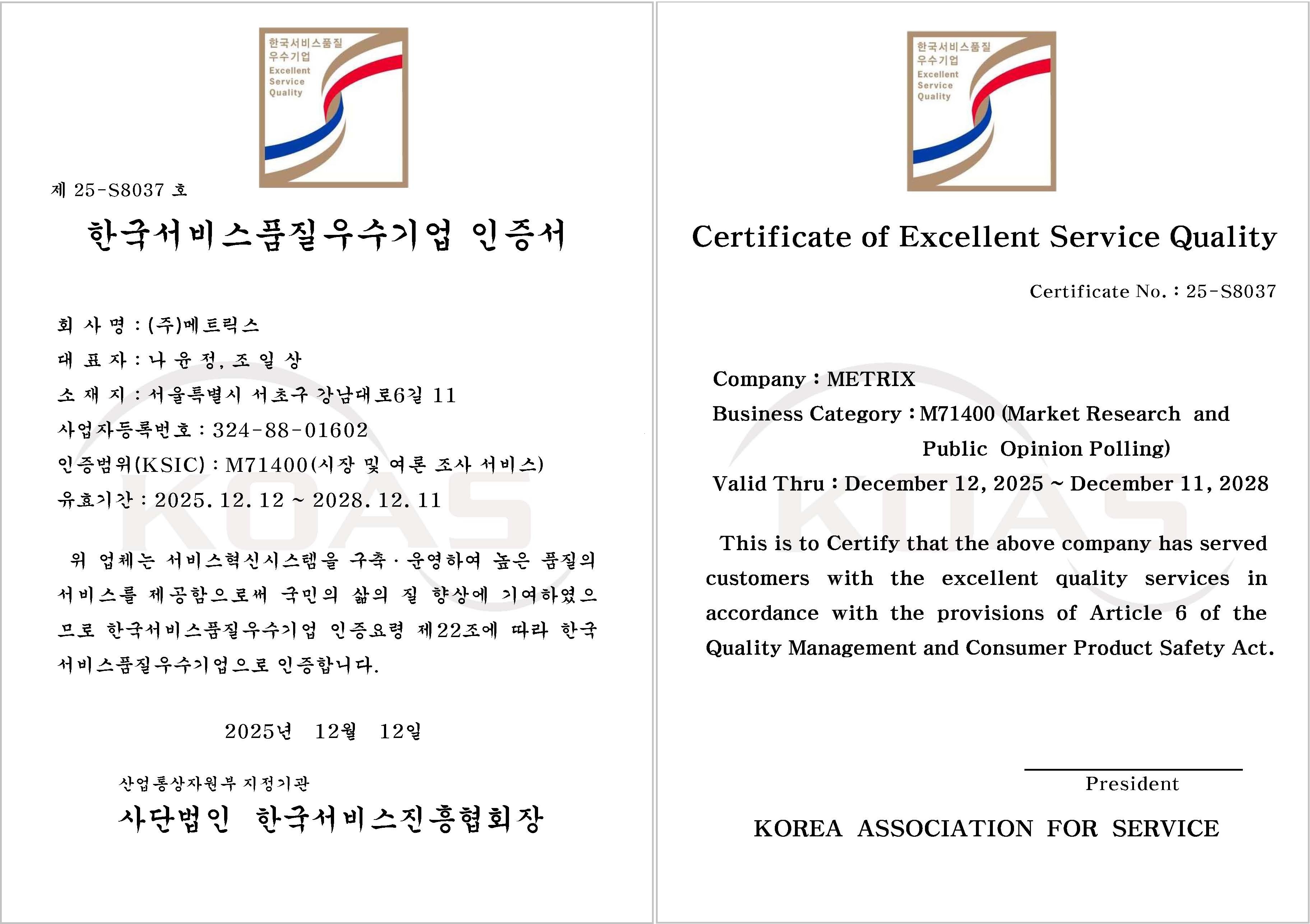 한국서비스품질우수기업 인증제도는 고객만족경영을 적극적으로 실천하고, 서비스 품질 수준이 우수한 기업과 기관을 대상으로 인증서를 수여해 우수업체로 공표하는 제도다. 한국서비스진흥협회는 지난 2025년 11월 28일 개최된 인증심사위원회 심의를 통해 메트릭스를 한국서비스품질우수기업으로 선정하고 네 번째 인증을 부여했다.